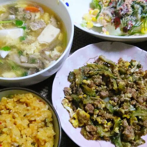 【今日の食卓】 マラ・パット・カイ・ムー(苦瓜、豚肉、鶏肉の炒め物)。 タイ版ゴーヤーチャンプルーと言った方が早いかな。