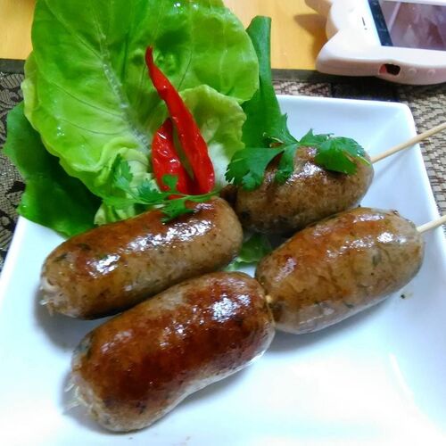 【今日の食卓】サイコック・ウンセン(春雨入りソーセージ)。もちろん腸詰めして作る。いつもより塩味を抑え目。食感がすごく良い。いつかサルタヤー食堂の売り物になるか。あんまり美味しいと強調するとサルちゃんのタイ友が嫉妬するので。(^-^ Sai grok u…