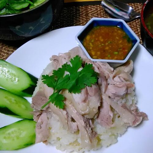 【今日の食卓】 昼食は、カオマンガイ(中国の海南鶏飯のタイ版)。