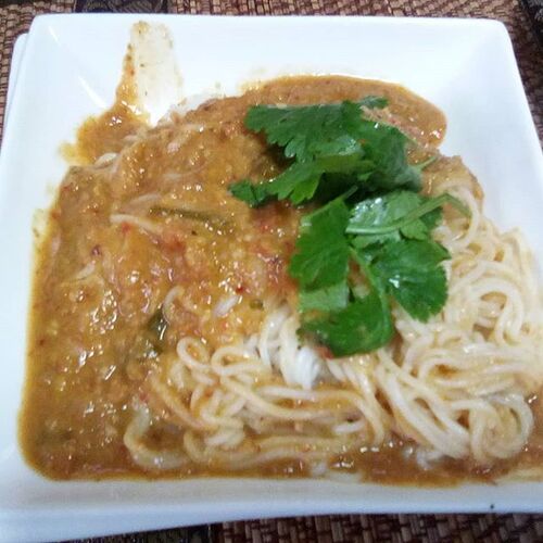 【今日の食卓】カノム・ヤム・ナムピック。タイ輸入の出来合いのソースを素麺にかけて。かなりの甘味に加えて辛さも強く、食べた後は何でもいいから甘いものを口に入れたくなる。 Kanom jeam nam pik. #タイ料理 #サルちゃんのタイ料理三昧 #ThaiFood【お知…